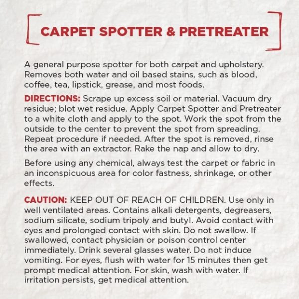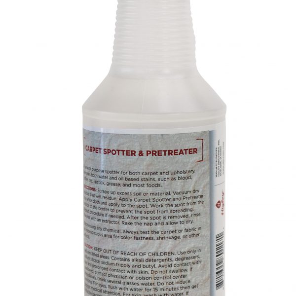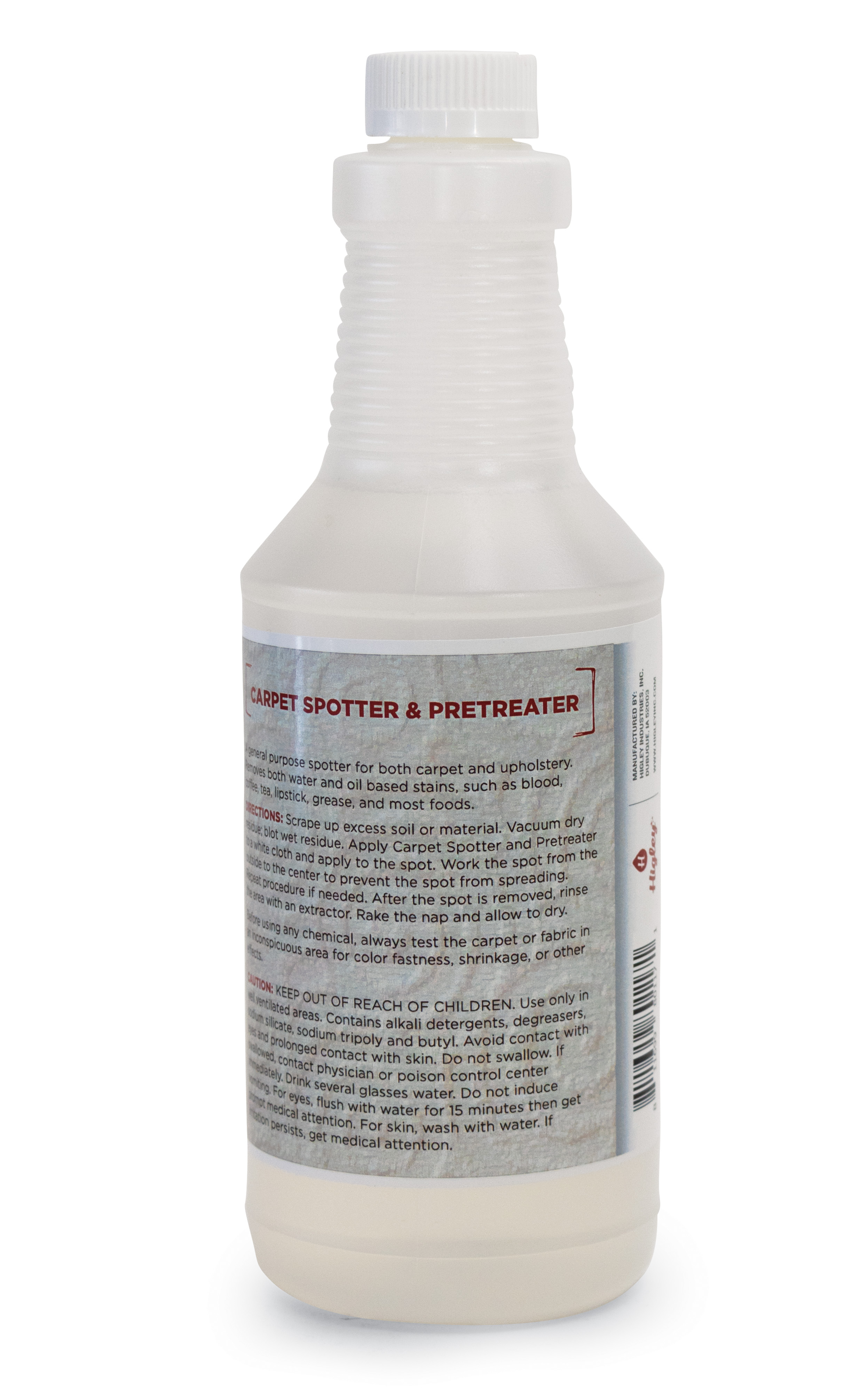 A ready to use, fast-acting carpet stain remover. Quickly dissolve away both water and oil based stains such as coffee, tea, oil, grease, ink, and many more. Leaves no residue on carpet or upholstery. Available in concentrated solution also.
