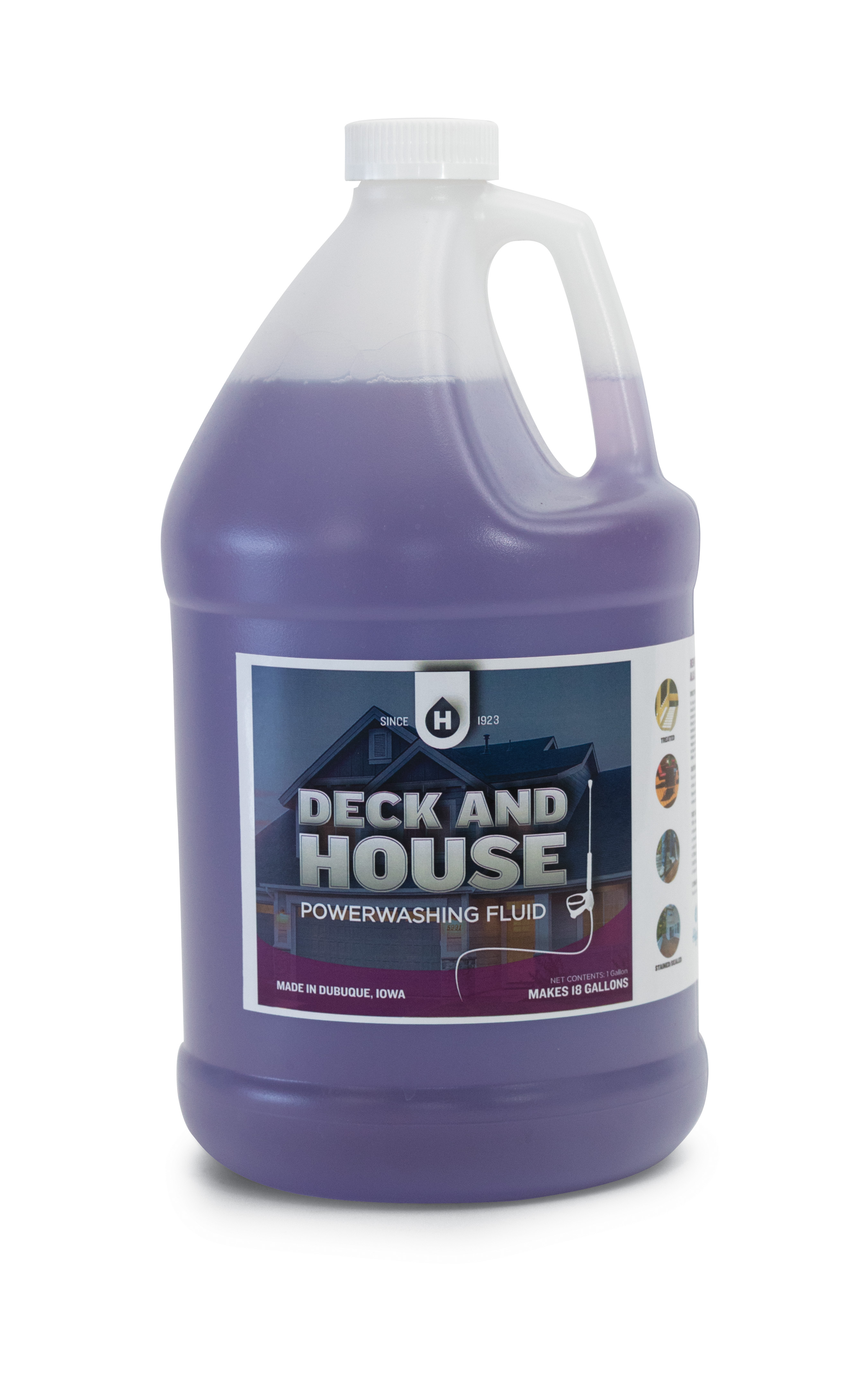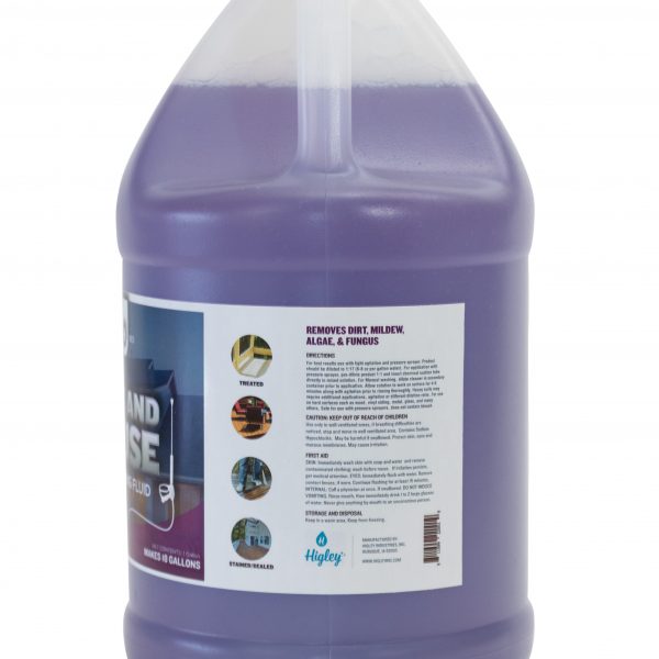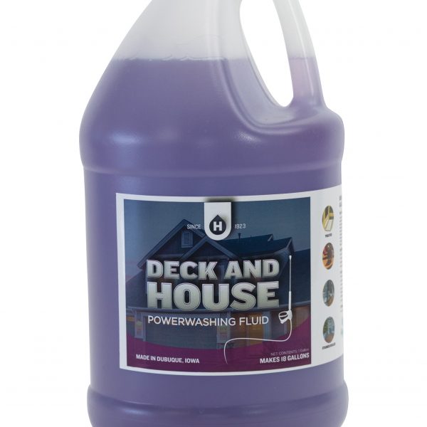 Deck and House wash is hard water stable and will not harm plant life. Removes mildew stains and chalk build-up on weathered paint. One gallons makes up to 18 gallons. For best results use with light agitation and pressure sprayer. Product should be diluted to 1:17 (6-8 oz per gallon water). For application with pressure sprayer, pre-dilute product 1:1 and insert chemical suction tube directly in mixed solution. For Manual washing, dilute cleaner in secondary container prior to application. Allow solution to work on surface for 4-6 minutes along with agitation prior to rinsing thoroughly. Heavy soils may require additional applications, agitation or different dilution ratio. For use on hard surfaces such as wood, vinyl siding, metal, glass, and many others. Safe for use with pressure sprayers, does not contain bleach