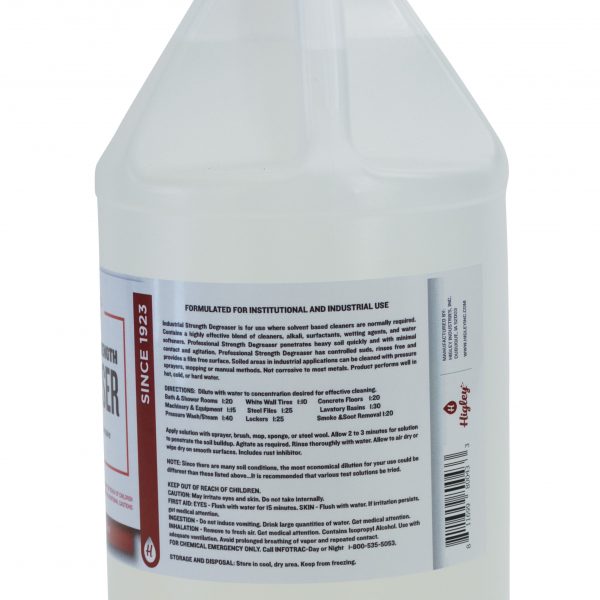 Industrial Strength Degreaser is for use where solvent based cleaners are normally required. Contains a highly effective blend of cleaners, alkali, surfactants, wetting agents, and water softeners. Penetrates heavy soils quickly and with minimal contact and agitation. Controlled suds, rinses free and provides a film free surface. Soiled areas in industrial applications can be cleaned with pressure sprayers, mopping or manual methods. Not corrosive to most metals. Product performs well in hot, cold, or hard water. Dilution rates will vary by application methods and environment.
