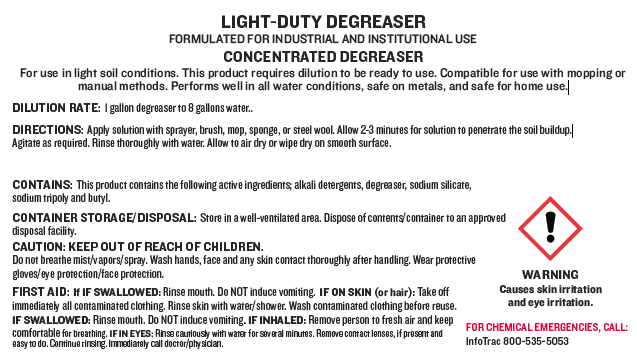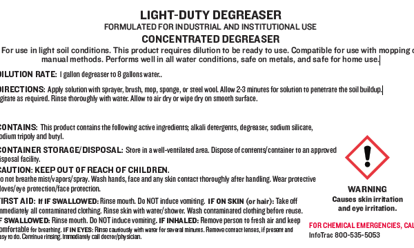 For use in light soil conditions. This product requires dilution to be ready to use. Compatible for use with mopping or manual methods. Performs well in all water conditions, safe on metals, and safe for home use.
