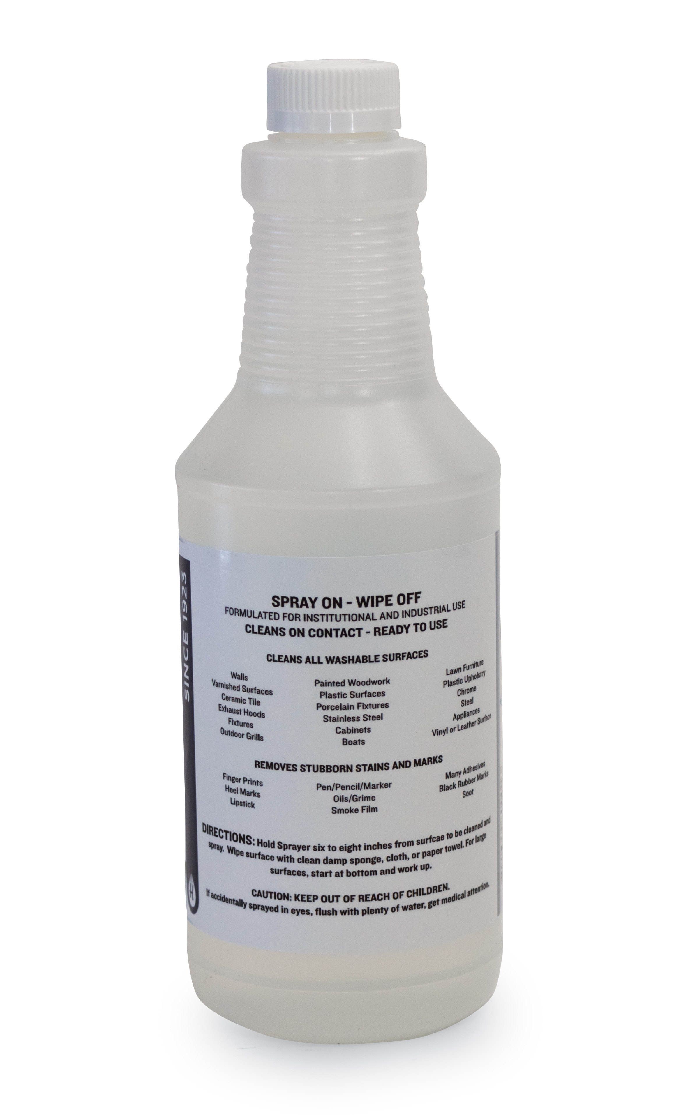 Ready to use, all-purpose, instant cleaner that can be used to spot clean all washable surfaces. Spray & Wipe cleans walls, cabinets, appliances, exhaust hoods, lawn furniture, outdoor grills, plastic and vinyl upholstery, painted woodwork, varnished surfaces, plastic or ceramic tile, porcelain, chrome, aluminum, stainless steel metal furniture and awnings, mobile homes and boats. It removes stubborn stains and marks, such as black rubber marks, crayon, permanent marker, ball point pens, heel and scuff marks, smoke film and soot with ease. Spray & Wipe, the instant cleaner, penetrates and emulsifies greases, oils, grit, and other soils making removal easy and complete. No rinsing necessary.