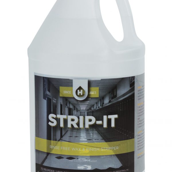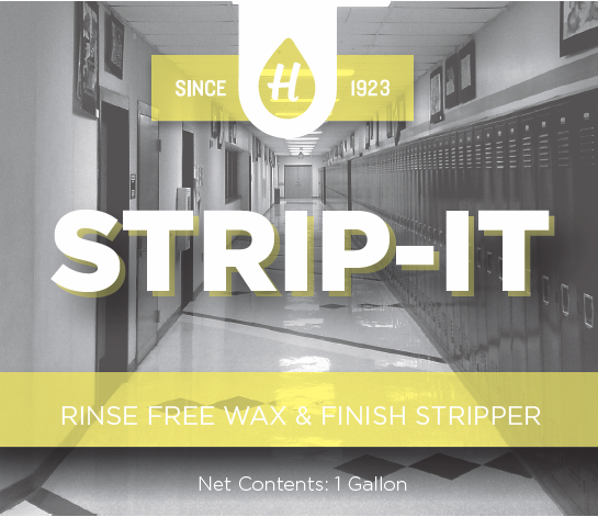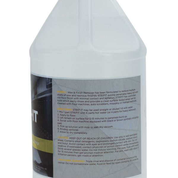 Wax & Finish Remover has been formulated to remove multiple coats of wax and resinous finishes. Strip-it quickly penetrates heavy soil and old floor finish with minimal contact and agitation. Controlled suds which easily rinses and provides a clean surface. Soiled areas can be cleaned with floor machines, auto scrubbers, mopping or manual methods. For normal stripping, 1:6 dilution rate is recommended. Heavy stripping may require up to 1:2 dilution or multiple applications.